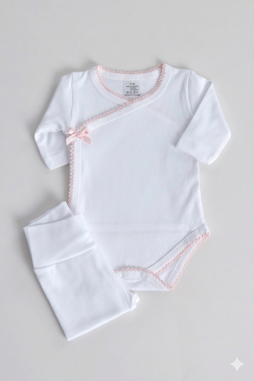 Overslagromper met roze strikje en broekje met voetje.